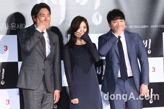 배우 조진웅(왼쪽부터), 이청아, 김대명이 3일 오전 서울 광진구 건대입구 롯데시네마에서 열린 영화 '해빙' 제작발표회에 참석해 포토타임을 하고 있다.