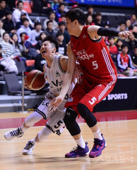 3일 고양실내체육관에서 ‘2016~2017 KCC 프로농구’ 고양오리온과 창원LG의 경기가 열렸다. 창원LG 김시래가 돌파 중 고양오리온 최진수의 마크에 고통스러워 하고 있다.