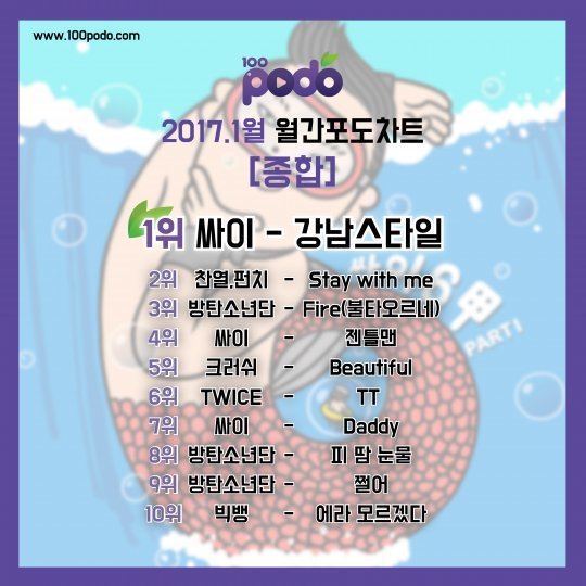 1월 ‘100포도닷컴’ 차트에서 종합부문 1위는 변함없이 강세를 이어가고 있는 싸이의 강남스타일이 차지했다. 이어 찬열, 펀치의 '스테이 위드 미(Stay With Me)‘, 방탄소년단의 ’파이어(불타오르네)‘, 싸이의 ’젠틀맨‘, 크러쉬의 ’뷰티플(Beautiful)‘이 차례대로 차지했다.