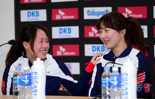 6일 강원도 강릉 스피드스케이팅장에서 ‘2017 국제빙상연맹(ISU) 스피드스케이팅 종목별 세계선수권대회’ 미디어데이가 열렸다. 스피드스케이팅 한국여자대표팀 박지우와 박승희가 서로 이야기를 나누고 있다.평창올림픽의 테스트이벤트로 치러지는 ‘2017 ISU 스피드스케이팅 종목별 세계선수권대회’는 오는 9일 여자 3,000m를 시작으로 12일까지 개최된다.