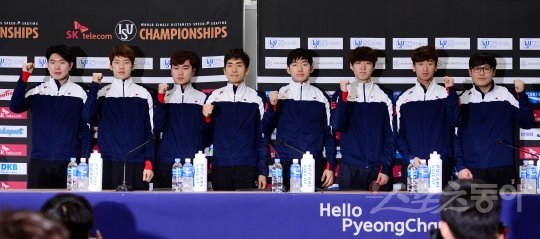 6일 강원도 강릉 스피드스케이팅장에서 ‘2017 국제빙상연맹(ISU) 스피드스케이팅 종목별 세계선수권대회’ 미디어데이가 열렸다. 스피드스케이팅 한국남자대표팀 김태윤(왼쪽부터), 김진수, 김민석, 이승훈, 주형준, 차민규, 김준호, 이석규 코치가 카메라를 향해 포즈를 취하고 있다.평창올림픽의 테스트이벤트로 치러지는 ‘2017 ISU 스피드스케이팅 종목별 세계선수권대회’는 오는 9일 여자 3,000m를 시작으로 12일까지 개최된다.