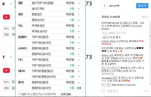 박경은 6일 자신의 인스타그램에 "All-kill! 감사합니다 정말.. 그리고 노트북 때부터 고생해준 @screlee thanks!"라는 말과 함께 사진 한 장을 게재했다.