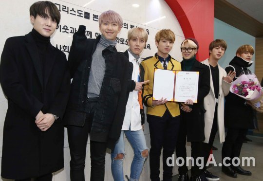 그룹 방탄소년단의 정국이 7일 오전 서울 구로구 서울공연예술고등학교에서 열린 졸업식에 참석하기 전에 포토타임을 하고 있다.
