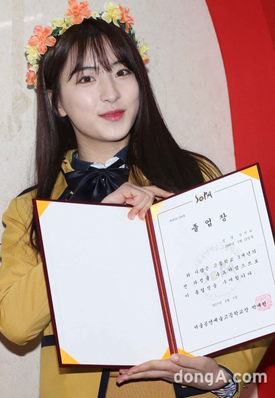 걸그룹 우주소녀의 은서가 7일 오전 서울 구로구 서울공연예술고등학교에서 열린 졸업식에 참석하기 전에 포토타임을 하고 있다. .