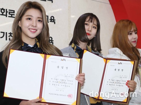 걸그룹 베리굿의 강세형(왼쪽)과 김현정이 7일 오전 서울 구로구 서울공연예술고등학교에서 열린 졸업식에 참석하기 전에 포토타임을 하고 있다.