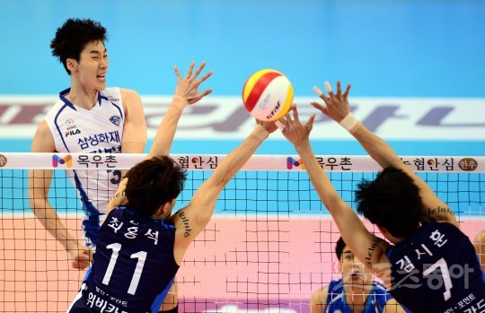 7일 대전충무체육관에서 ‘2016-2017 NH농협 V리그’ 대전 삼성화재와 서울 우리카드의 경기가 열렸다. 삼성화재 박철우가 우리카드 블로커를 피해 스파이크를 날리고 있다.