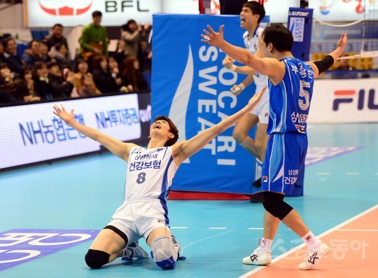 7일 대전충무체육관에서 ‘2016-2017 NH농협 V리그’ 대전 삼성화재와 서울 우리카드의 경기가 열렸다. 5세트 삼성화재 류윤식이 가로막기를 성공시킨 뒤 환호하고 있다.