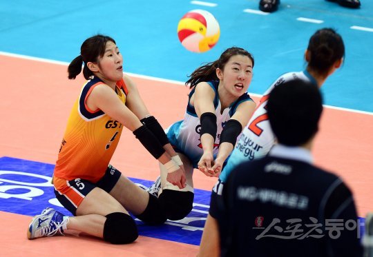 8일 수원실내체육관에서 ‘2016-2017 NH농협 V리그’ 수원 현대건설과 서울 GS칼텍스의 경기가 열렸다. GS칼텍스 나현정과 강소휘가 수비를 펼치고 있다.