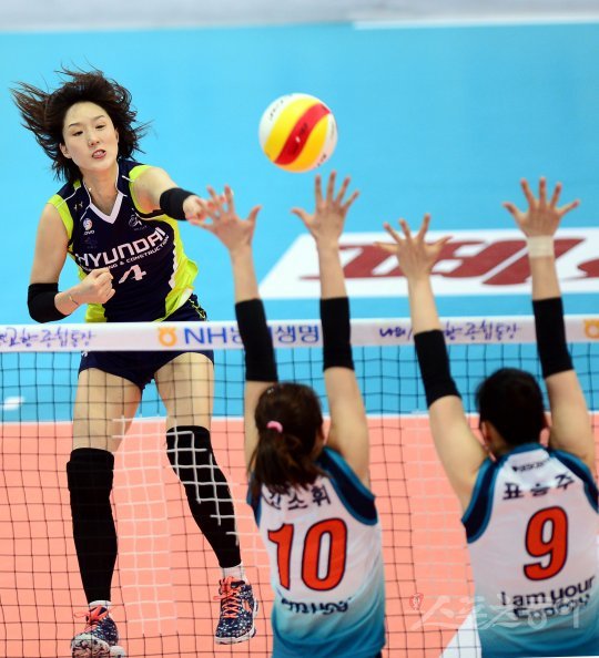 8일 수원실내체육관에서 ‘2016-2017 NH농협 V리그’ 수원 현대건설과 서울 GS칼텍스의 경기가 열렸다. 현대건설 황연주가 GS칼텍스 블로커를 피해 스파이크를 날리고 있다.