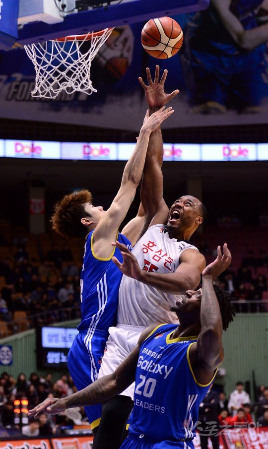 8일 잠실실내체육관에서 열린 ‘2016~2017 KCC 프로농구’ 삼성과 KGC인삼공사 경기에서 KGC 사이먼이 삼성 라틀리프의 수비를 뚫고 골밑슛을 하고 있다.