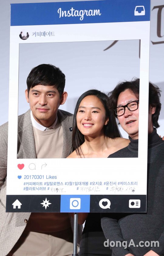 배우 오지호, 윤진서, 감독 이현하가 9일 오전 서울 건대입구 한 멀티플렉스에서 열린 영화 '커피 메이트' 제작보고회에 참석해 포토타임을 하고 있다.