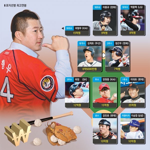 야수 쪽에서는 롯데로 돌아온 1루수 이대호가 25억원으로 KBO 연봉킹에 올랐다. 김태균(한화)의 16억원보다 무려 9억원이 많은 압도적 톱이다. 김태균은 전체 연봉 랭킹 2위임에도 1루수 연봉에서는 이대호에게 밀렸다. 포수 강민호(롯데·10억원) 3루수 최정(SK·12억원) 외야수 최형우(KIA·15억원) 지명타자 이승엽(삼성·10억원)까지 6명의 타자가 10억원 연봉을 정복했다. 외국인타자 최고연봉은 한화 로사리오의 18억원이다.
