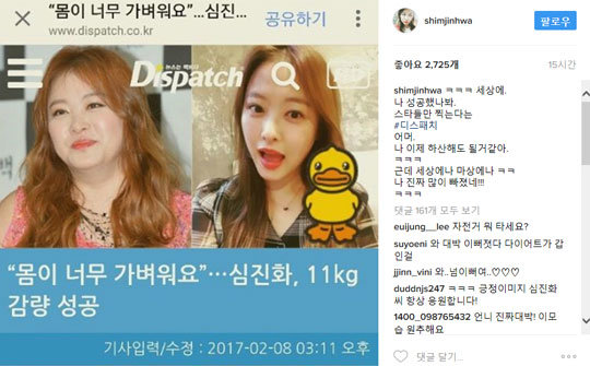 심진화는 10일 자신의 인스타그램에 기사 캡처 사진과 함께 “세상에. 나 성공했나봐. 스타들만 찍는다는 #디스패치 어머. 나 이제 하산해도 될거같아. 근데 세상에나 마상에나 나 진짜 많이 빠졌네!”라는 글을 게재했다.