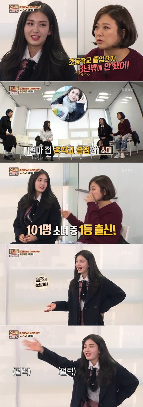 이날 전소미는 교복 느낌의 의상을 입고 나타났다. 올해 중학교를 졸업하고 고등학교 입학을 압둔 전소미. 이에 강예원 김숙 홍진경 등은 엄청난 나이 차를 실감했고 “우리가 너와 걸그룹을 해도 될까”라고 어색해했다.