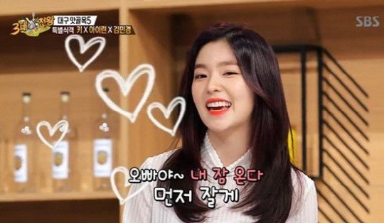 이어 아이린은 “대구에서는 잠 온다라는 말을 쓰는데 서울에서는 졸리다는 말이다.‘오빠야 내 잠 온다. 먼저 잘게’라고 말한다”고 대구 사투리 애교를 선보였다.