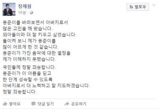 장제원 의원은 11일 자신의 SNS를 통해 “(장)용준이를 바라보면서 아버지로서 많은 고민을 해 왔다. 외아들이라 더 잘 키우고 싶었다. 돌이켜 보니 내가 용준이를 많이 아프게 한 것 같다. 용준이가 가진 음악에 대한 열정을 이해하지 못했다”고 전했다.