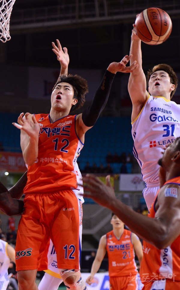 12일 인천삼산월드체육관에서 ‘2016~2017 KCC 프로농구’ 서울삼성과 인천전자랜드 경기가 열렸다. 서울삼성 김준일이 레이업 슛을 시도하는 인천전자랜드 정효근에게 슛블럭을 하고 있다.