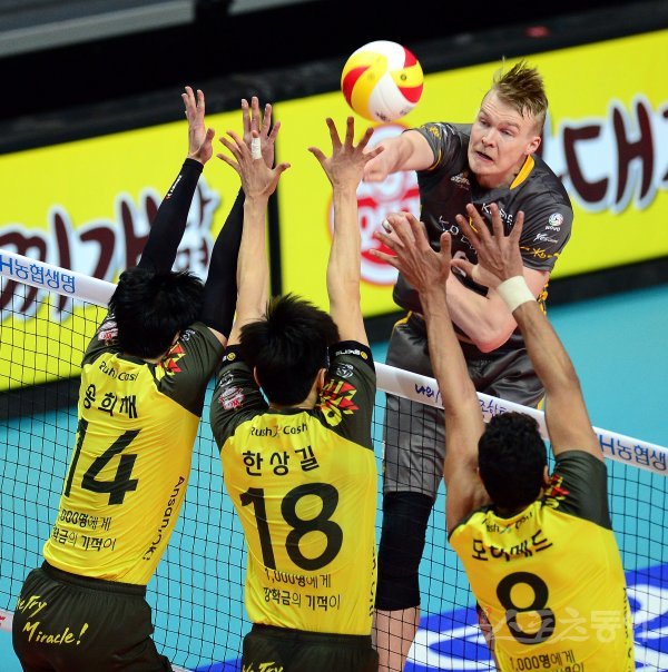 12일 안산상록수체육관에서 열린 ‘NH농협 2016~2017 V리그’ 남자부 KB손해보험과 OK저축은행 경기에서 KB손해보험 우드리스가 OK저축은행의 블로킹 사이로 스파이크 공격을 하고 있다.