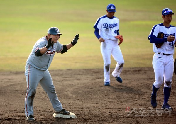 12일 오키나와 차탄 야구장에서 한화 이글스와 주니치 드래곤즈의 연습경기에서 8회초 무사에서 한화 허도환이 2루타를 치고난 뒤 환호하고 있다.