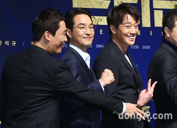배우 조재윤(왼쪽부터), 한석규, 김래원이 14일 오전 서울 강남구 압구정CGV에서 열린 영화 '프리즌' 제작발표회에 참석해 포토타임을 하고 있다.