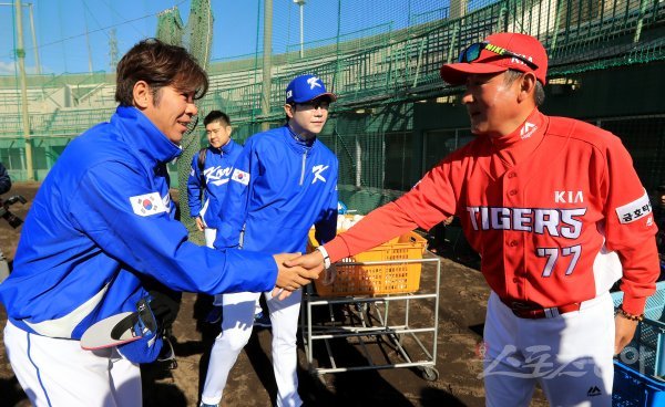 2017 월드베이스볼클래식(WBC) 한국대표팀이 14일 일본 오키나와 우루마시 구시카와 야구장에서 공식훈련을 가졌다. WBC 대표팀 임창용이 훈련에 앞서 격려차 대표팀을 방문한 KIA 김기태 감독과 악수를 나누고 있다. WBC 대표팀은 오는 22일까지 오키나와에서 훈련 및 연습경기를 치른뒤 23일 귀국한다.