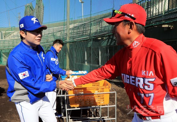 2017 월드베이스볼클래식(WBC) 한국대표팀이 14일 일본 오키나와 우루마시 구시카와 야구장에서 공식훈련을 가졌다. WBC 대표팀 양현종이 훈련에 앞서 격려차 대표팀을 방문한 양현종과 악수를 나누고 있다. WBC 대표팀은 오는 22일까지 오키나와에서 훈련 및 연습경기를 치른뒤 23일 귀국한다.