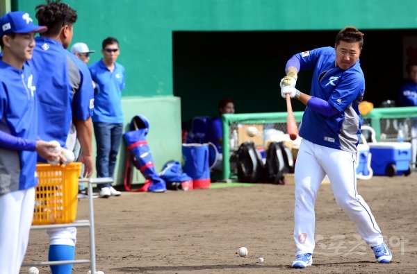 2017 월드베이스볼클래식(WBC) 한국대표팀이 14일 일본 오키나와 우루마시 구시카와 야구장에서 공식훈련을 가졌다. WBC 대표팀 최형우가 김태균의 배팅볼로 타격훈련을 하고 있다. WBC 대표팀은 오는 22일까지 오키나와에서 훈련 및 연습경기를 치른뒤 23일 귀국한다.