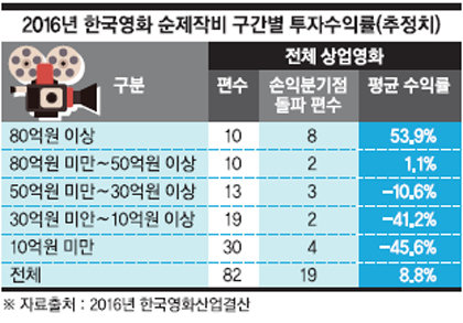 제작비가 낮을수록 평균 수익률의 적자폭은 더욱 커진다. 지난해 제작비 10억원 미만 영화는 30편. 단위별 분포(표 참조)로는 제작편수가 가장 많지만, 평균 수익률은 -45.6%로 최저치다. 10억원 이상∼30억원 미만 영화 19편의 평균 수익률 역시 -41.2%다.