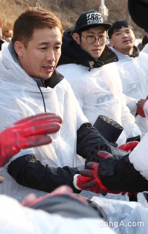 15일 오전 서울 서대문구 개미마을에서 열린 로드FC 사랑의 연탄 나눔 행사에 참석자들이 연탄을 나르고 있다.