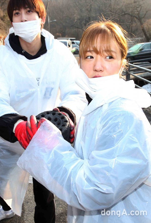 그룹 블락비 재효(왼쪽) 걸그룹 에이핑크의 보미가 15일 오전 서울 서대문구 개미마을에서 열린 로드FC 사랑의 연탄 나눔 행사에 참석해 연탄을 나르고 있다.