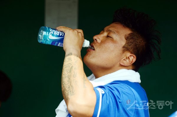 2017 월드베이스볼클래식(WBC) 한국대표팀이 15일 일본 오키나와 우루마시 구시카와 야구장에서 공식훈련을 가졌다. WBC 대표팀 김태균이 무더위에 물을 마시고 있다.WBC 대표팀은 오는 22일까지 오키나와에서 훈련 및 연습경기를 치른뒤 23일 인천국제공항을 통해 귀국한다.