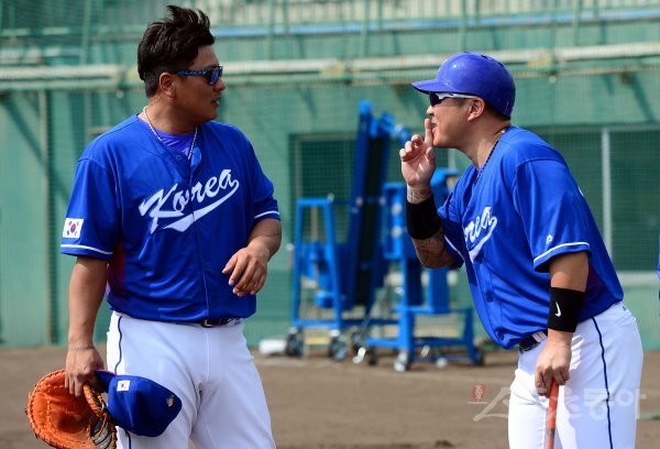 2017 월드베이스볼클래식(WBC) 한국대표팀이 15일 일본 오키나와 우루마시 구시카와 야구장에서 공식훈련을 가졌다. WBC 대표팀 김태균과 최형우가 이야기를 나누고 있다.WBC 대표팀은 오는 22일까지 오키나와에서 훈련 및 연습경기를 치른뒤 23일 인천국제공항을 통해 귀국한다.