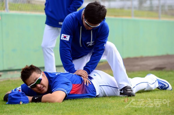 2017 월드베이스볼클래식(WBC) 한국대표팀이 15일 일본 오키나와 우루마시 구시카와 야구장에서 공식훈련을 가졌다. WBC 대표팀 최형우가 허리 마사지를 받고 있다.WBC 대표팀은 오는 22일까지 오키나와에서 훈련 및 연습경기를 치른뒤 23일 인천국제공항을 통해 귀국한다.