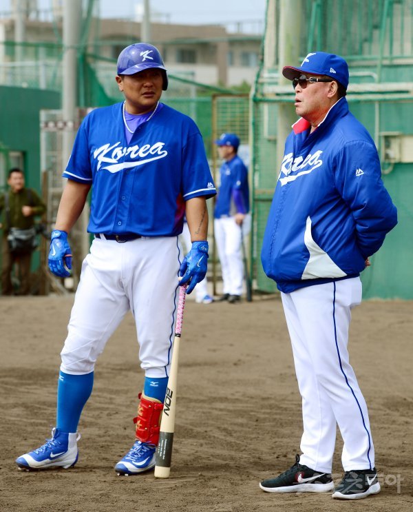 2017 월드베이스볼클래식(WBC) 한국대표팀이 15일 일본 오키나와 우루마시 구시카와 야구장에서 공식훈련을 가졌다. WBC 대표팀 김인식 감독이 김태균과 이야기를 나누고 있다.WBC 대표팀은 오는 22일까지 오키나와에서 훈련 및 연습경기를 치른뒤 23일 인천국제공항을 통해 귀국한다.