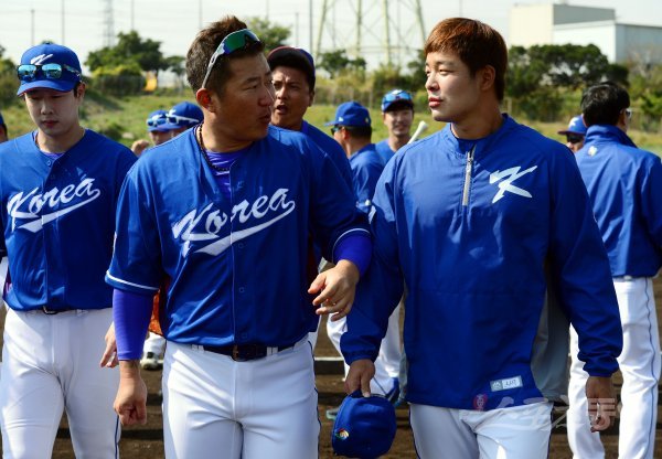 2017 월드베이스볼클래식(WBC) 한국대표팀이 15일 일본 오키나와 우루마시 구시카와 야구장에서 공식훈련을 가졌다. WBC 대표팀 최형우와 민병헌이 서로 이야기를 나누고 있다.WBC 대표팀은 오는 22일까지 오키나와에서 훈련 및 연습경기를 치른뒤 23일 인천국제공항을 통해 귀국한다.