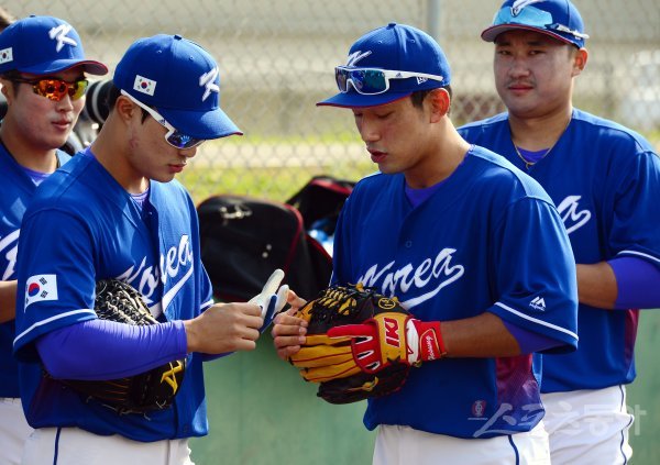 2017 월드베이스볼클래식(WBC) 한국대표팀이 15일 일본 오키나와 우루마시 구시카와 야구장에서 공식훈련을 가졌다. WBC 대표팀 김하성과 서건창이 이야기를 나누고 있다.WBC 대표팀은 오는 22일까지 오키나와에서 훈련 및 연습경기를 치른뒤 23일 인천국제공항을 통해 귀국한다.
