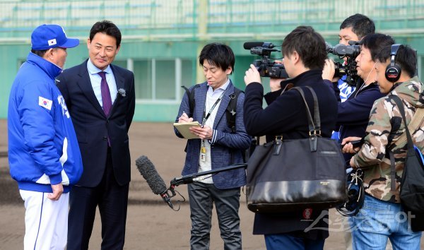 2017 월드베이스볼클래식(WBC) 한국대표팀이 15일 일본 오키나와 우루마시 구시카와 야구장에서 공식훈련을 가졌다. WBC 대표팀 김인식 감독이 선수출신 마에다 도모노리 아사히 TV 해설위원과 인터뷰를 하고 있다.WBC 대표팀은 오는 22일까지 오키나와에서 훈련 및 연습경기를 치른뒤 23일 인천국제공항을 통해 귀국한다.