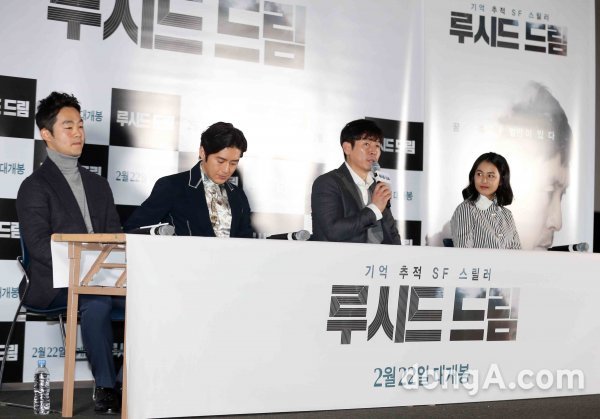 15일 오후 서울 성동구 왕십리 한 멀티플렉스관에서 열린 영화 루시드 드림 언론시사회에서 출연진이 참석해 인사말을 하고 있다.