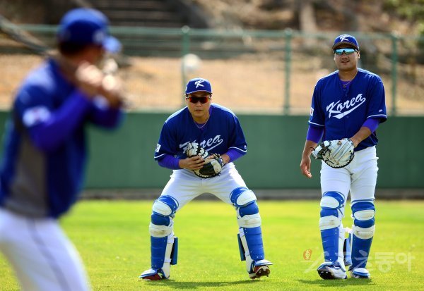 2017 월드베이스볼클래식(WBC) 한국대표팀이 15일 일본 오키나와 우루마시 구시카와 야구장에서 공식훈련을 가졌다. WBC 대표팀 양의지와 김태군이 수비훈련을 펼치고 있다.WBC 대표팀은 오는 22일까지 오키나와에서 훈련 및 연습경기를 치른뒤 23일 인천국제공항을 통해 귀국한다.