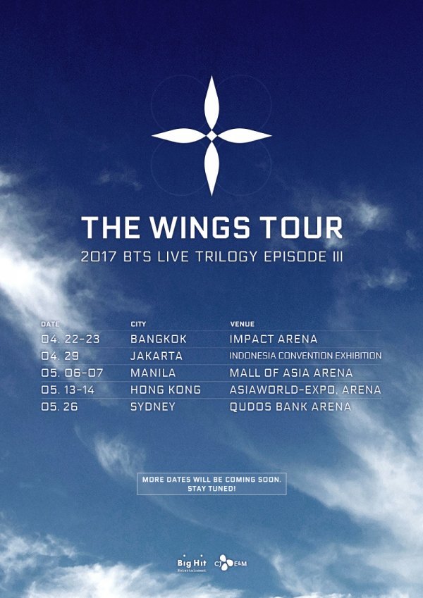 방탄소년단은 15일 공식 팬카페와 SNS 채널을 통해 투어 포스터를 공개하고 동남아시아, 호주 등 '방탄소년단 라이브 트릴로지 에피소드 3 윙스 투어(2017 BTS LIVE TRILOGY EPISODE III THE WINGS TOUR)'의 추가 공연 소식을 알렸다.