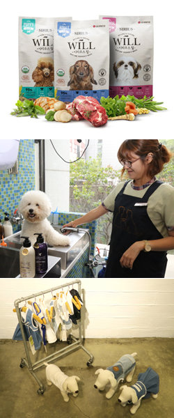 ‘펫코노미’ 전성시대를 맞아 반려동물 시장을 선점하기 위한 업체 간 경쟁이 심화되고 있다. (위쪽부터) LG생활건강의 펫 푸드 브랜드 ‘시리우스 윌’, 애경 ‘휘슬’의 올바른 목욕 클래스 모습, 코오롱인더스트리 ‘래;코드’의 ‘페넥트’ 라인. 사진제공|LG생활건강·애경·코오롱인더스트리