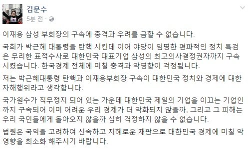 김문수 전 지사는 17일 오전 자신의 페이스북에 “이재용 삼성 부회장의 구속에 충격과 우려를 금할 수 없다”며 “국회가 박근혜 대통령을 탄핵 시킨 데 이어 야당이 임명한 편파적인 정치 특검은 무리한 표적수사로 대한민국 대표기업 삼성의 최고의사결정권자까지 구속시켰다”라고 주장했다.