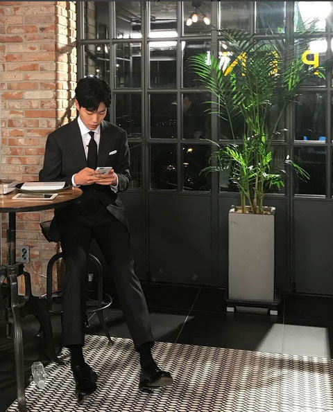 사진 속 류준열은 블랙 수트를 입고 휴대폰을 보고 있다. 그는 수트를 완벽하게 소화해 한층 멋진 모습이다.