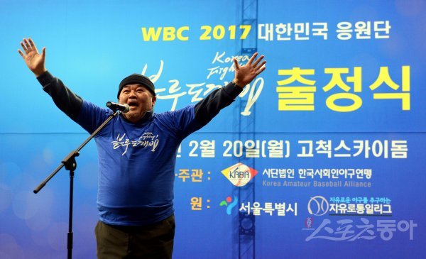 20일 서울 고척 스카이돔에서 ‘2017 WBC 대한민국 응원단 블루도깨비 출정식’이 열렸다. 출정식에 참석한 명예응원단장 배우 이근희가 응원을 외치고 있다.