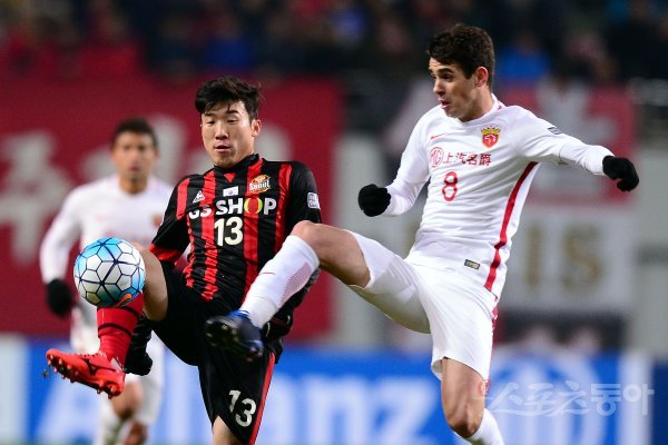 21일 서울월드컵경기장에서 아시아챔피언스리그(ACL) F조 1차전 FC서울과 상하이 상강(중국) 경기가 열렸다. FC서울 고요한이 상하이상강오스카와 볼다툼을 벌이고 있다.
