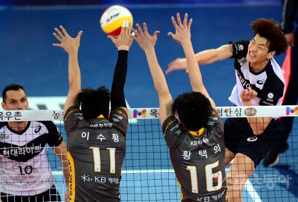 21일 천안 유관순체육관에서 ‘2016-2017 NH농협 V리그’ 천안 현대캐피탈과 구미 KB손해보험의 경기가 열렸다. 현대캐피탈 송준호가 KB손해보험 블로커를 피해 스파이크를 날리고 있다.