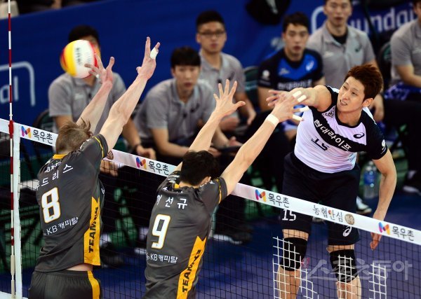 21일 천안 유관순체육관에서 ‘2016-2017 NH농협 V리그’ 천안 현대캐피탈과 구미 KB손해보험의 경기가 열렸다. 현대캐피탈 문성민이 KB손해보험 블로커를 피해 스파이크를 날리고 있다.