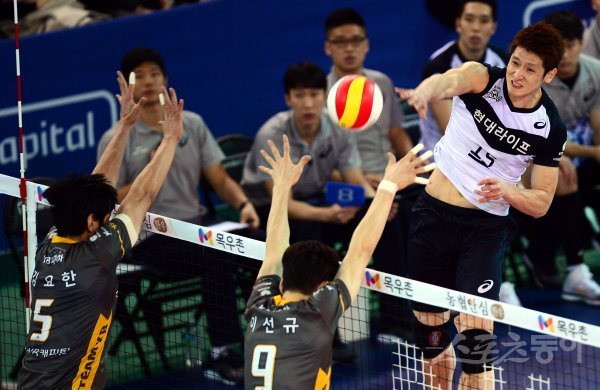 21일 천안 유관순체육관에서 ‘2016-2017 NH농협 V리그’ 천안 현대캐피탈과 구미 KB손해보험의 경기가 열렸다. 현대캐피탈 문성민이 KB손해보험 블로커를 피해 스파이크를 날리고 있다.