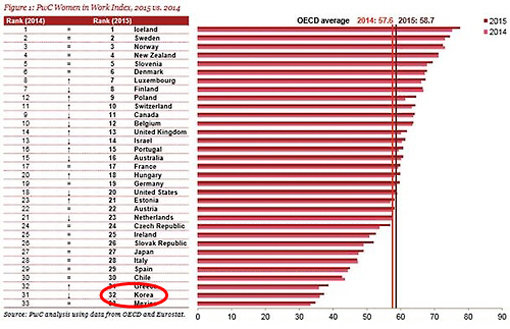 남녀 임금 평등과 여성의 노동 참여율, 고용 안정성, 정규직 근로자 여성 비율 등을 토대로 산출한 한국의 여성 경제활동지수는 37.3으로 33개국 중 32위에 머물렀다. 한국은 지난해 31위에서 한 계단 떨어졌다. 한국보다 저조한 국가는 멕시코(34.8)뿐. 33개국의 평균 여성 경제활동 지수는 58.7이다. 일본은 49.1로 지난해 순위 27위를 유지했다.