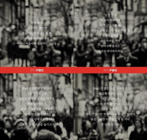 '환영받지 못한 관계 / 둘은 짐작했었지 / 현실을 꾸며낸 채 끝을 미루고 / 애써 침착했었지 / 못다 한 그리움의 소행일까 / 불쑥 네 소식 들리면 / 난 모든 가능성에서 도망 나와 / 저 먼 곳에 마음을 옮기고'